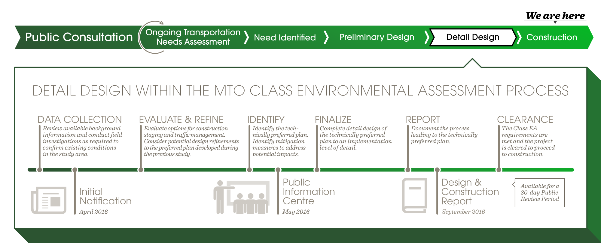 The Preliminary Design study was undertaken as a Group ‘B’ project under the MTO Class EA, as it included a significant widening of the “footprint” beyond the roadbed of an existing highway and a significant modification in traffic access. It was also classified as a Schedule ‘C’ project under the Municipal Class EA since it included major expansion to an existing facility. The study was documented in the May 2013 Transportation Environmental Study Report.